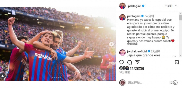 10月9日讯 阿尔巴宣布将在本赛季结束后退役,巴萨中场球员加维社媒发文致敬。