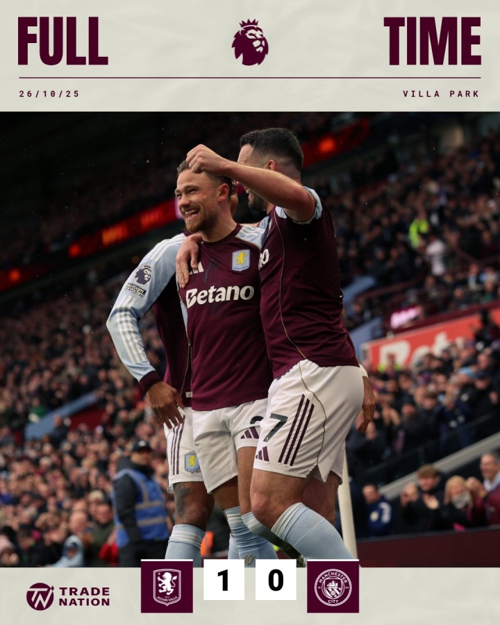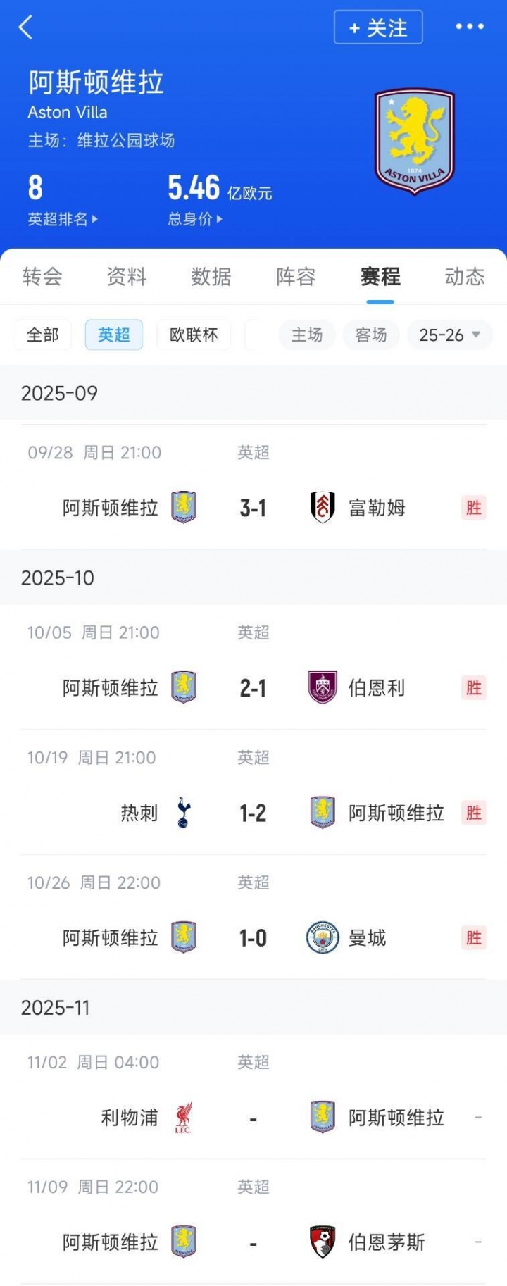 10月27日讯 英超第9轮,阿斯顿维拉1-0力克曼城,豪取职业联赛 4连胜。