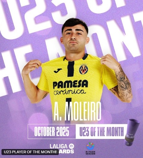 10月30日讯 西甲官方宣布,比利亚雷亚尔中场球员阿尔维托-莫莱罗(Alberto Moleiro)当选10月最佳U23球员。