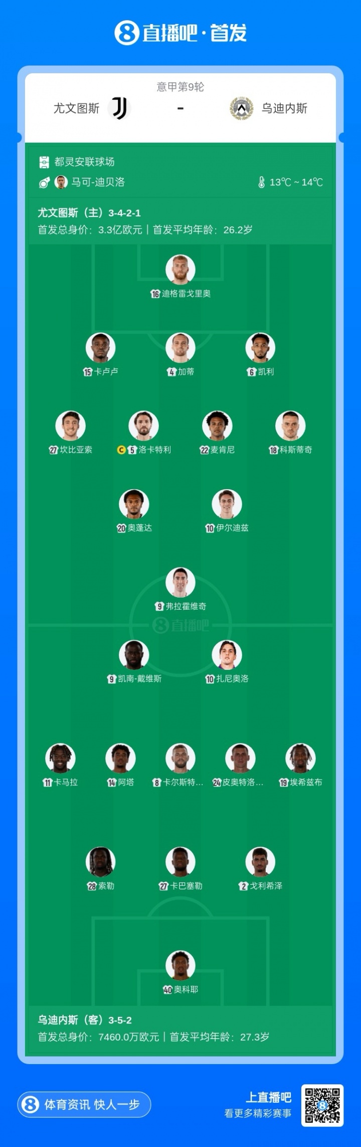 尤文vs乌迪内斯杆位:伊尔迪兹、弗拉霍维奇、奥蓬达先发