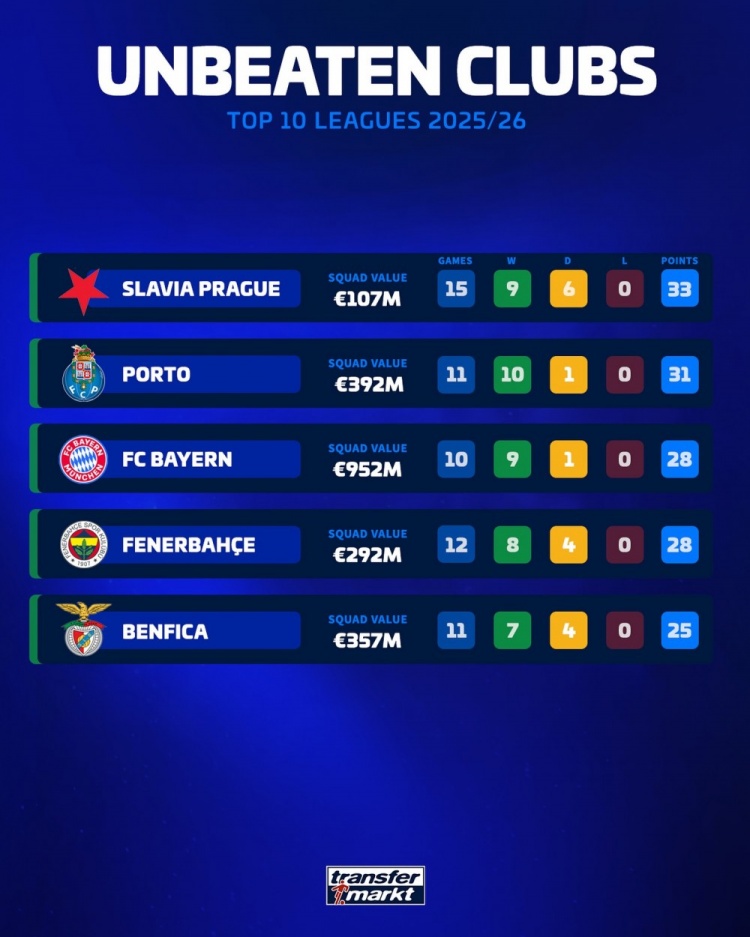 本赛季前10职业联赛 仅5队不败:拜仁、费内巴切、波尔图、本菲卡在列