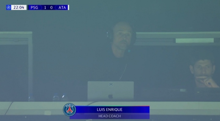自上周日对阵朗斯的赛事 以来,恩里克便开始在媒体看台顶端的一个较为安静的角落观赛并进行指挥。他身边坐着三名视频分析师(文森特-布鲁内、昆汀-比利和安托万-吉洛坦)以及他的助教之一吉列姆-埃尔南德斯-福尔格拉。