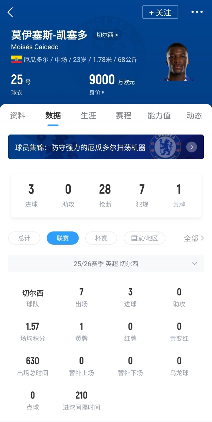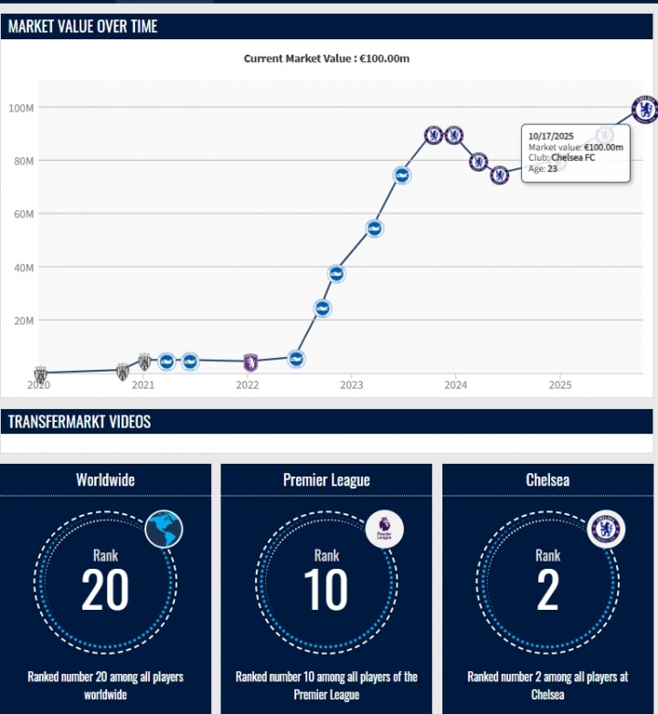 亿元兽腰!切尔西中场球员凯塞多身价上涨1000万欧,升至1亿欧元!
