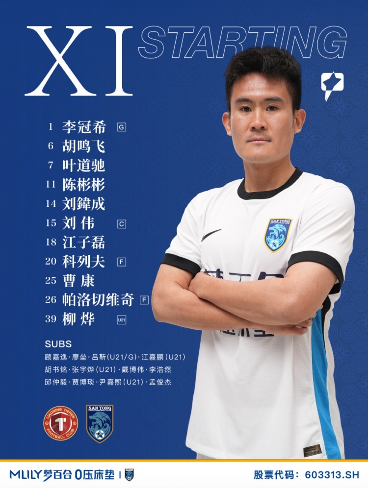南通支云杆位:1-李冠希、7-叶道驰、6-胡鸣飞、15-刘伟、18-江子磊、25-曹康、26-帕罗切维奇、14-刘鍏成、11-陈彬彬、20-科列夫、39-柳烨(U21)