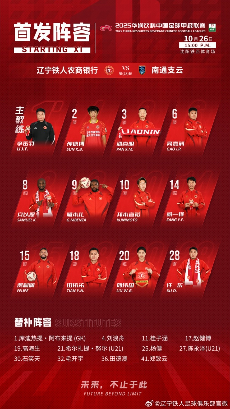 10月26日讯 在中甲职业联赛 第28轮中,辽宁铁人将在主场作战 迎战南通支云。赛事 开始前,苏超联赛回放免费观看双方公布了出场名单。