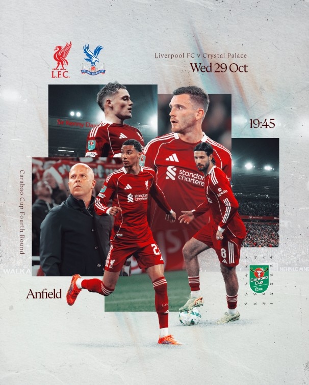 10月29日讯 北京时间10月30日3:45,职业联赛 杯第4轮,利物浦主场作战 对阵水晶宫,利物浦官方发布海报预热。