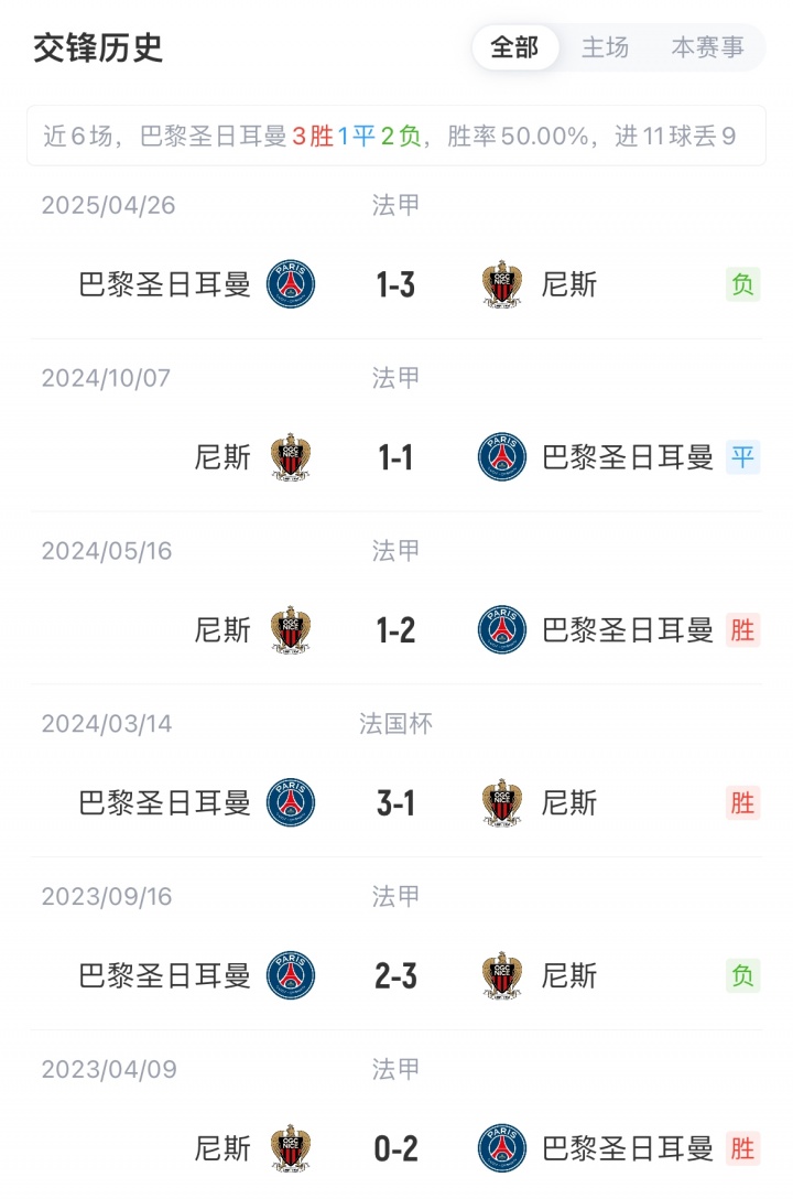巴黎职业联赛 6胜3平1负积21分领跑法甲积分榜,24直播网各项赛事连续7场不败;尼斯职业联赛 5胜2平3负积17分暂位法甲第8,近5轮不败。巴黎对阵尼斯已连续2场不胜(1平1负)。