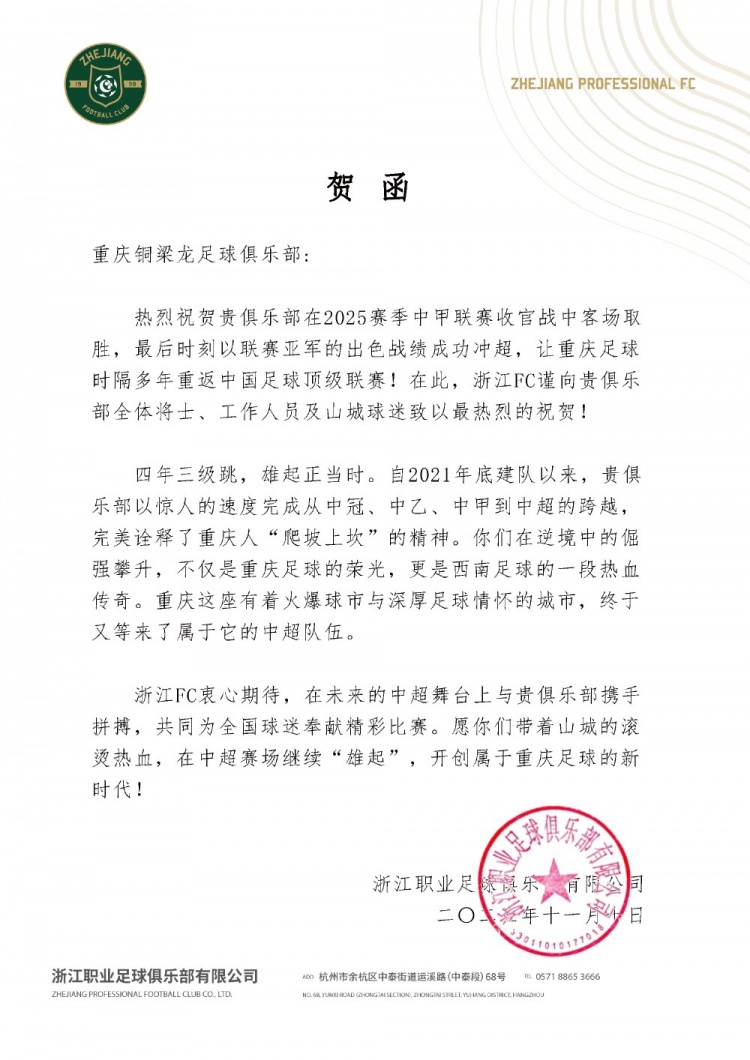 浙江FC衷心期待,在未来的中超舞台上与贵俱乐部携手奋斗 ,共同为全国球迷奉献出色 赛事 。愿你们带着山城的滚烫热血,在中超赛场继续“雄起”,开创属于重庆古代足球 的新时代!