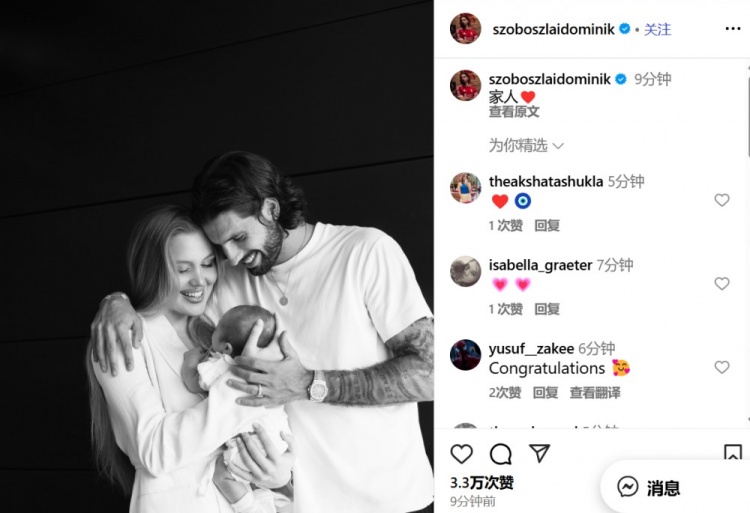 索博斯洛伊晒与妻子和爱女合照,配文:家庭❤️