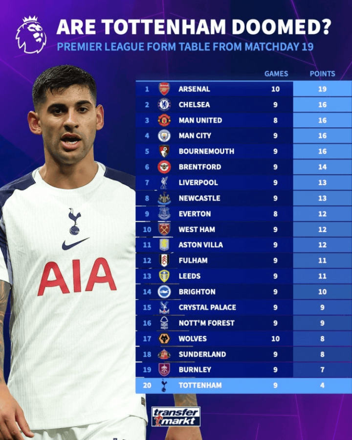 英超第19轮以来积分榜: 阿森纳10场19分居首, 热刺9场4分垫底
