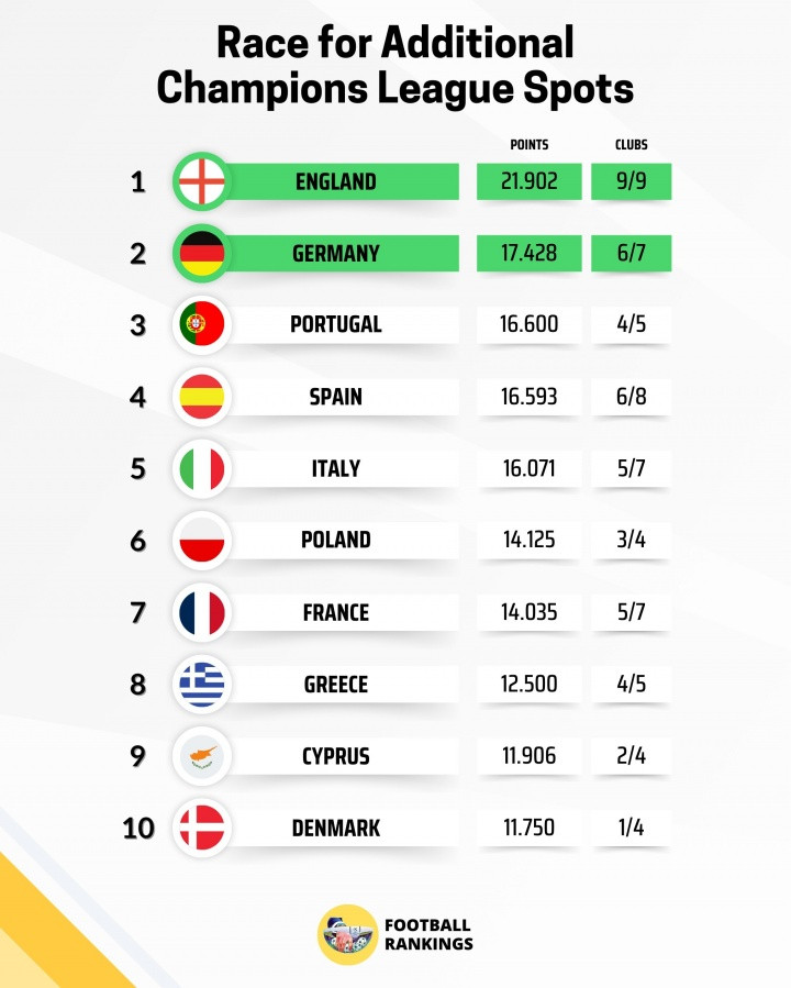 欧战系数: 英格兰9队征战拿下第5个欧冠名额, 德甲暂列第2意甲第5