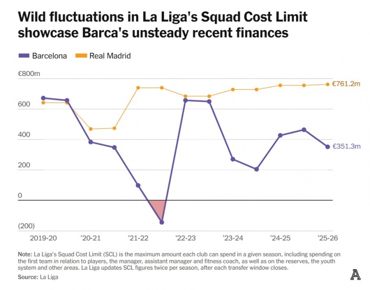 西甲球队成本上限的剧烈波动凸显了巴萨近期财务状况不稳定