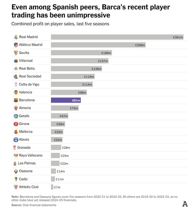 此后卖人收益缩水,即便23/24赛季通过出售登贝莱、凯西和尼科-冈萨雷斯获利8060万欧元。过去五赛季球员销售总利润仅8140万欧元,若非21/22赛季对球员价值计提1.6亿欧元减值,数字将更难看。此利润水平在西甲中游,远追赶 于两家马德里俱乐部及欧洲多家对手。
