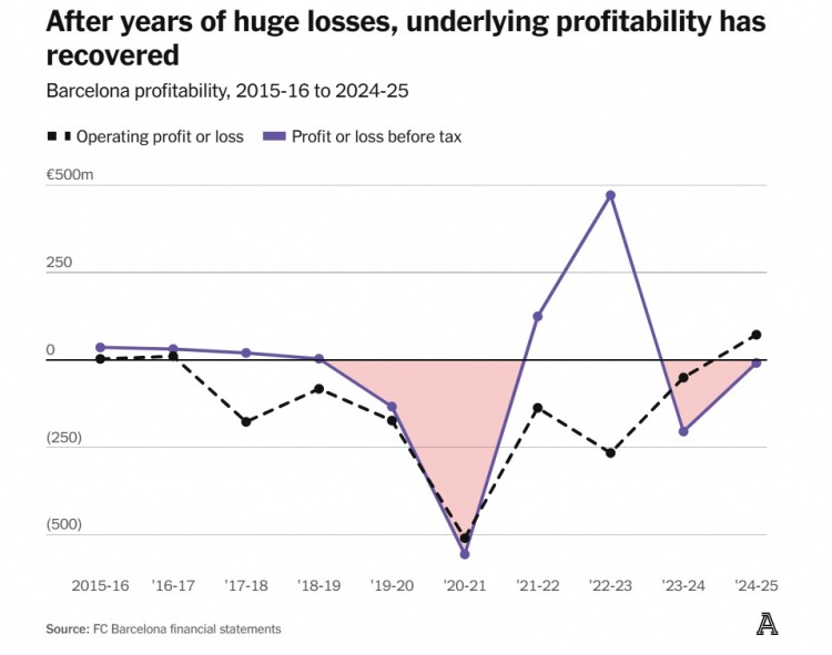 巴萨在多年巨大亏损之后,基础盈利能力已复健