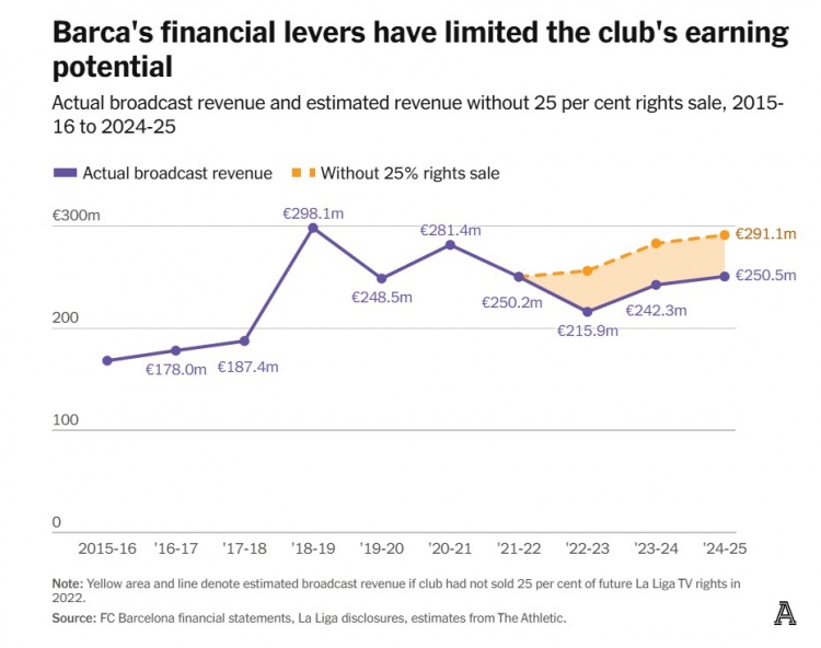 现金注入帮助抵消了后一财年近2亿欧元的运营现金赤字。巴萨拥有未知成本的回购权,可在25年期限前提早赎回这些权益。但与此同时,出售意味着他们放弃了可观的年度收入。