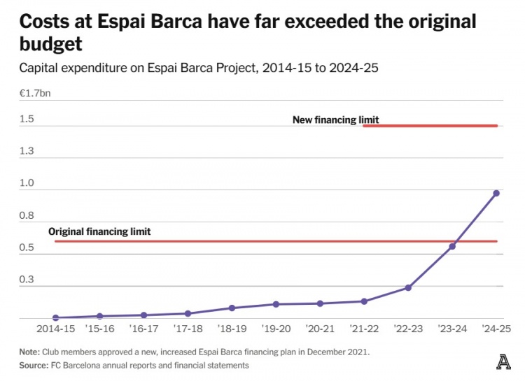 四年过去,修订方案再度延期,资金持续流出:22/23赛季投入1.06亿欧元,次年增至3.22亿欧元,上赛季再投4.15亿欧元。截至2025年6月,项目资本支出已达9.75亿欧元(见下图)。后续投入仍将巨大。