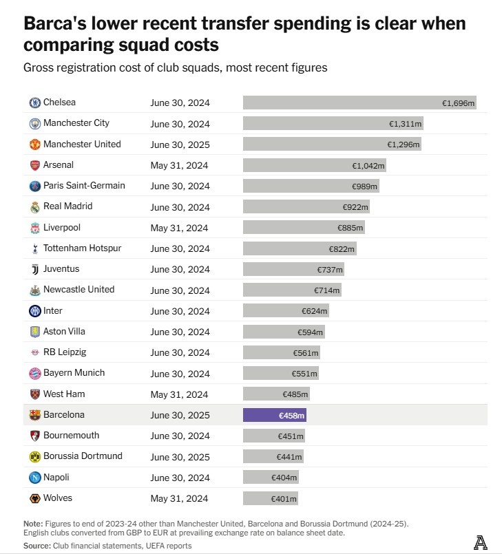 当比较球队成本时,巴萨近期较低的转会支出显而易见