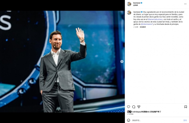 梅西写道:非常感谢迈阿密市的认可,这个地方对我和我的家人来说都非常特别。从第一天起,这里的人们就让我们感到无比温暖,江苏电视台卫视在线直播就像今天在商业论坛现场一样,我们再次感受到了这座美丽城市居民的热情和支持。同时,我也要感谢迈阿密国际俱乐部及球迷一直以来的支持。
