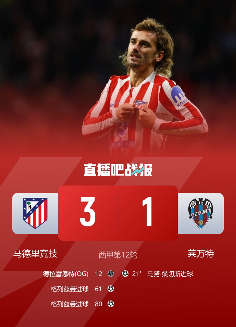 马竞本轮3-1击败莱万特,格列兹曼后备 两球成为取胜功臣。
