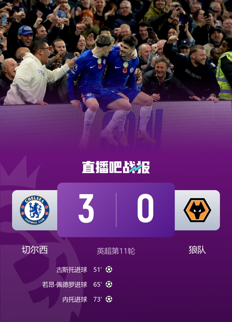 切尔西本轮3-0轻取狼队,蓝军方面古斯托、佩德罗和内托得分 ,切尔西此役后暂升第2。