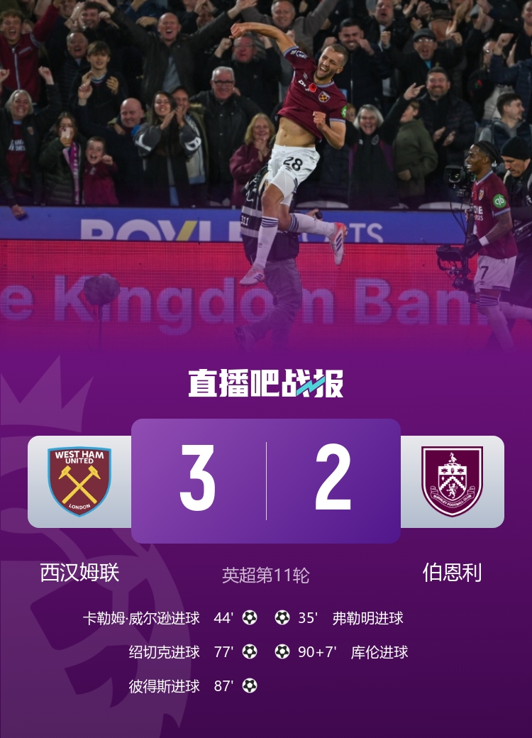 西汉姆本轮3-2惊险击败伯恩利,西汉姆在经过此前低迷后久违地拿下两连胜。