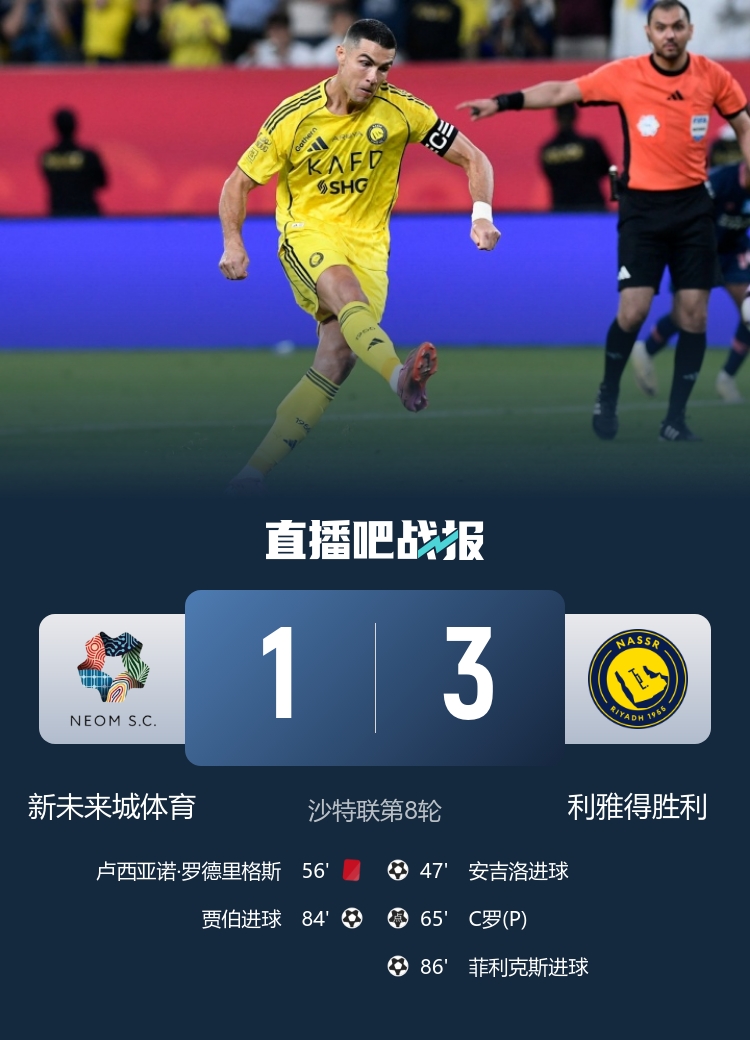 本轮沙特联,利雅得获胜 3-1击败新未来城体育,C罗、菲利克斯和安吉洛破门。