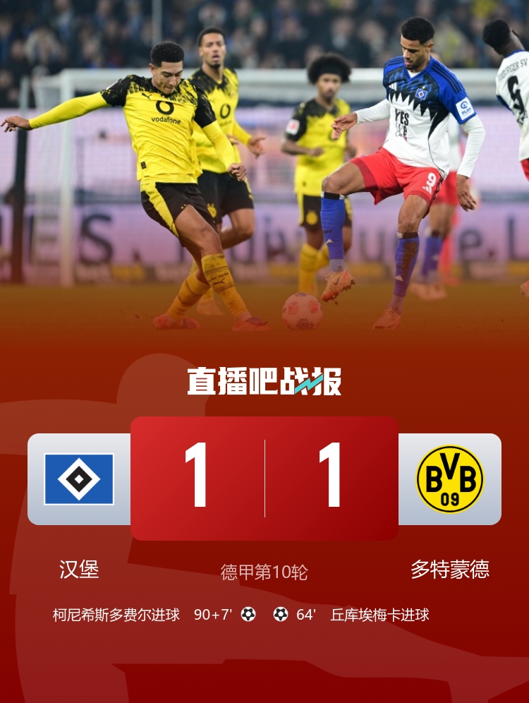 多特本轮1-1遭汉堡绝平,多特方面得分 来自丘库埃梅卡。