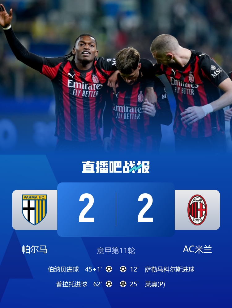 米兰2-2帕尔马10轮不败先赛积分平榜首 萨56破门+造点莱奥点射